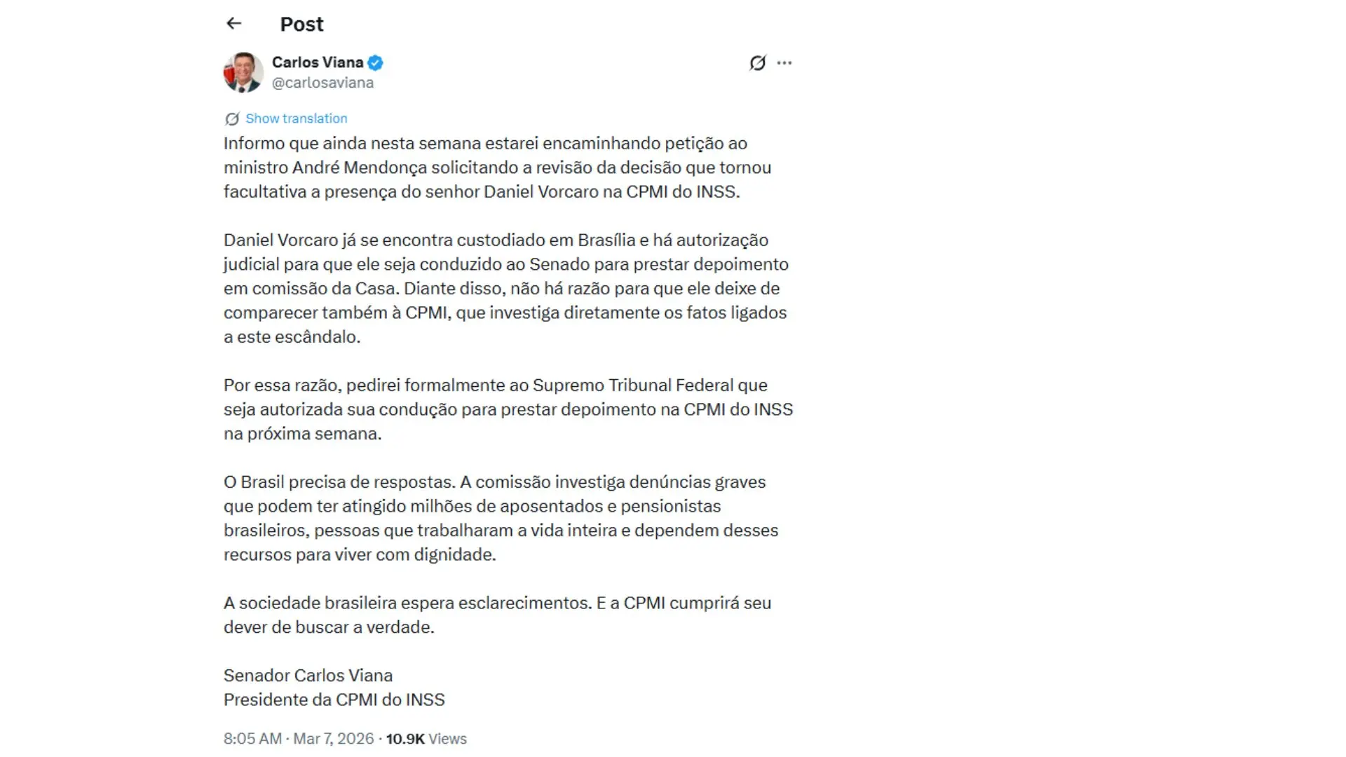 “Informo que ainda nesta semana estarei encaminhando petição ao ministro André Mendonça solicitando a revisão da decisão que tornou facultativa a presença do senhor Daniel Vorcaro na CPMI do INSS. Daniel Vorcaro já se encontra custodiado em Brasília e há autorização judicial para que ele seja conduzido ao Senado para prestar depoimento em comissão da Casa. Diante disso, não há razão para que ele deixe de comparecer também à CPMI, que investiga diretamente os fatos ligados a este escândalo”, afirmou o senador.